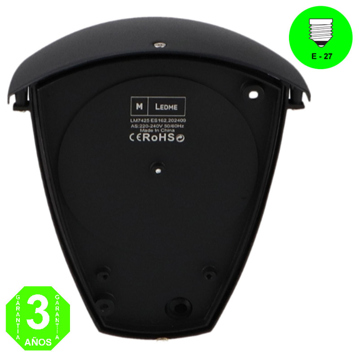 Aplique Pared RONSE H color negro. Fabricado con acero y pmma, materiales de alta calidad con unas propiedades de solidez y consistencia elevada. Para instalar en Pared en interiores y exteriores. Recomendado para cualquier estancia en la que se requiera luz decorativa, indirecta o luz de compañía. Este aplique permite personalizar completamente el tipo de luz en función de las bombillas E27 que instalemos. Esto nos permite adaptar la luminosidad de la luminaria a las necesidades de cada espacio. Debido a su diseño, se puede emplear tanto en espacios comerciales, interiores, exteriores protegidos, etc. Grado de protección IP44 adecuado para uso en espacios húmedos, y también en exteriores bajo coberturas, además de ser suficientemente robusto para las exigencias mecánicas requeridas y su material asegura durabilidad y resistencia ante las condiciones ambientales. Garantía de 3 años, para que en caso de mal funcionamiento por problemas de fábrica se pueda cambiar por uno nuevo y 15 días de devolución.