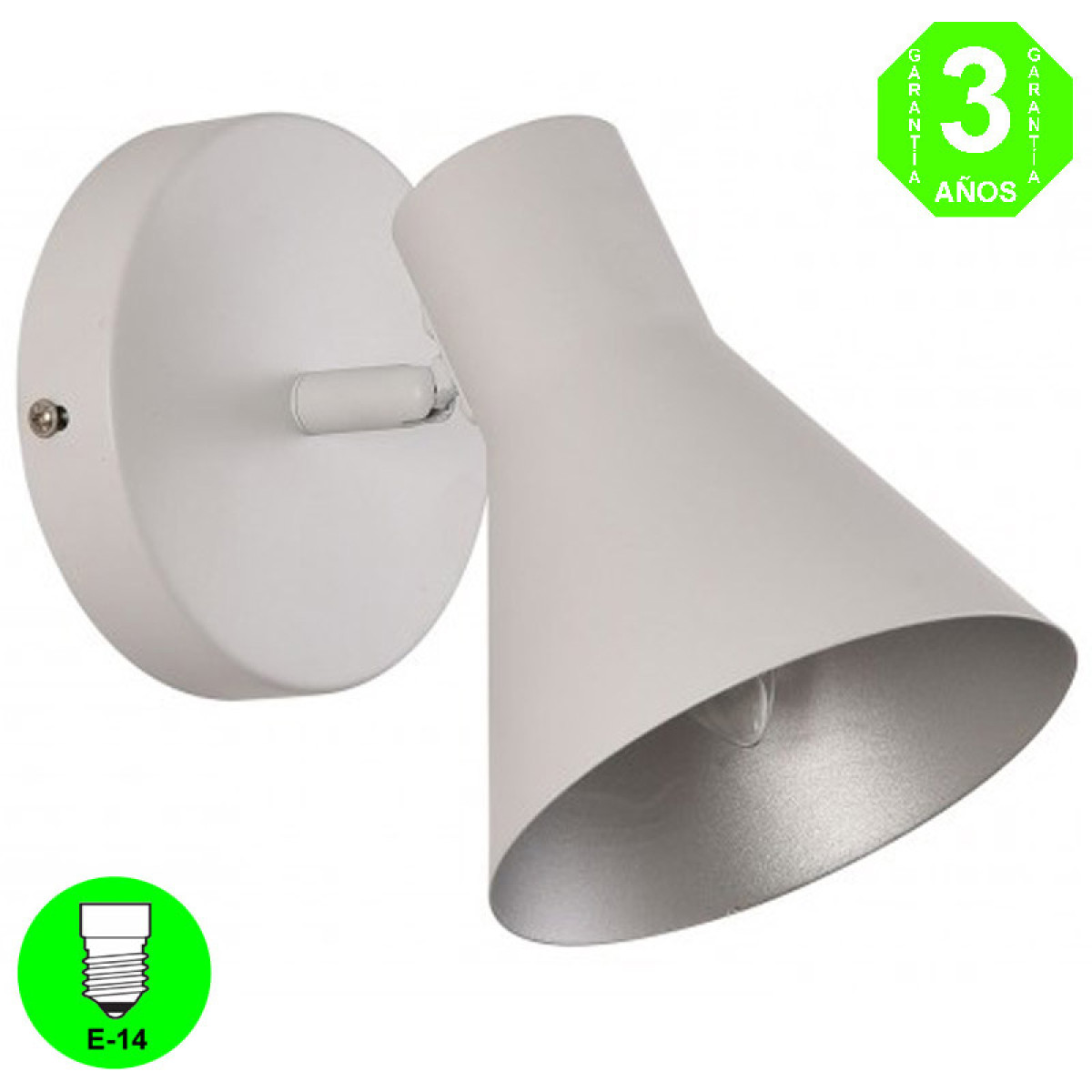 Aplique APB color Blanco mate, interior Plata orientable. Estilo rústico muy actual. Se adapta fácilmente al diseño interior que se desee. Ofrece soluciones uso residencial y comercial. Se puede alicatar en pared o techo, mediante una Cruceta de metal y dos tornillos y se cubre con la base circular del aplique. Grado de protección IP20 (válido para polvo y humedad en interiores), además de ser suficientemente robusto para las exigencias mecánicas requeridas. Garantía de 3 años, para que en caso de mal funcionamiento por problemas de fábrica se pueda cambiar por uno nuevo y 15 días de devolución. Diseñado para emplear bombillas LED o Halógenas (Max 50W) tipos esférica G45, Vela o Reflectora R50. Admite otros tipos de bombillas led con casquillo E14.
